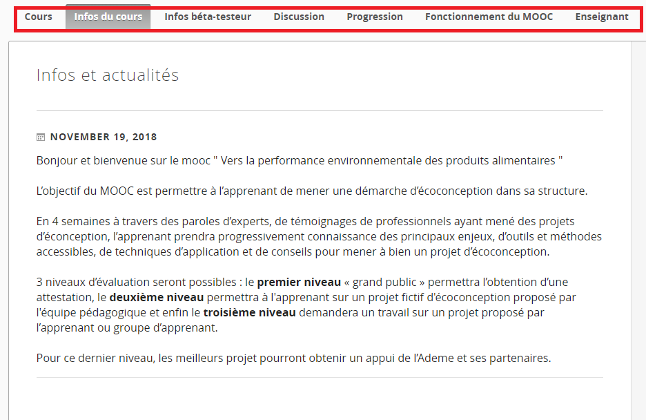 Depuis cet onglet, retrouvez des précisions sur le fonctionnement du MOOC (objectifs, charge de travail & organisation, dates d'ouverture, ressources proposées, suivre ma progression, obtenir mon attestation, participer aux discussions).