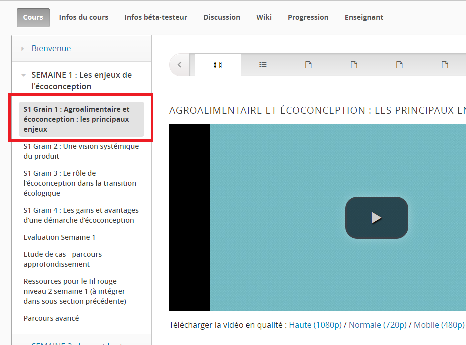 Le MOOC "Vers la performance environnementale des produits alimentaires" est divisé en 1 séquence introductive et 4 séquences de contenus.